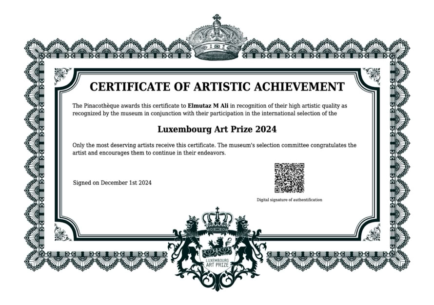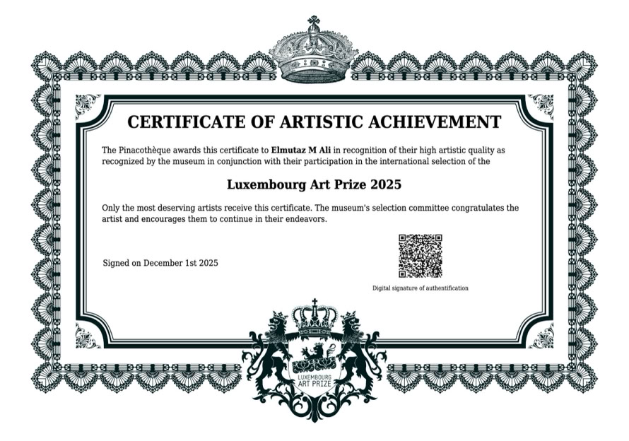 تشرفت بالحصول على شهادة الاستحقاق الفني من متحف La Pinacothèque في باريس لعامين متتاليين (2024 و2025)، وذلك ضمن الاختيار الدولي لجائزة Luxembourg Art Prize، تقديرًا للمشاركة الفنية المتميزة وجودة الأعمال المقدّمة.